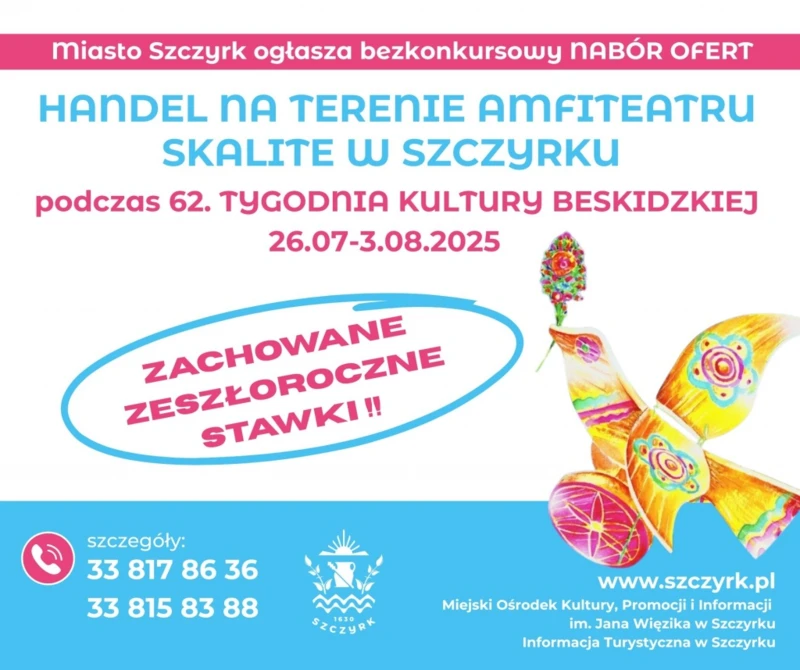 Miejski Ośrodek Kultury, Promocji i Informacji im. Jana Więzika w Szczyrku ogłasza bezkonkursowy nabór ofert na handel na terenie amfiteatru „Skalite” podczas trwania 62. Tygodnia Kultury Beskidzkiej w okresie od 26 lipca do 3 sierpnia 2025 roku.