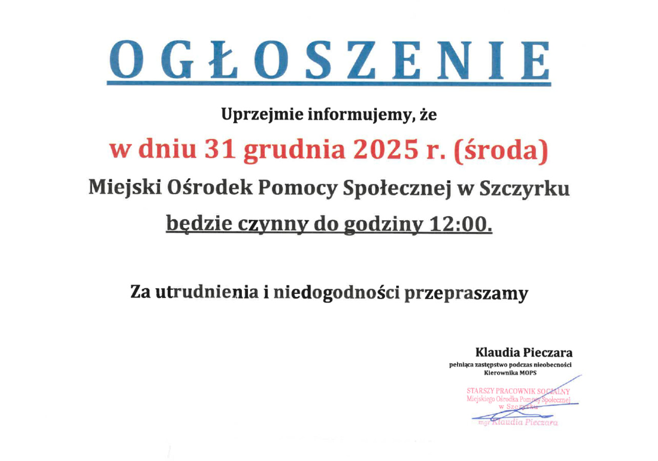 Godziny pracy MOPS w Sylwestra