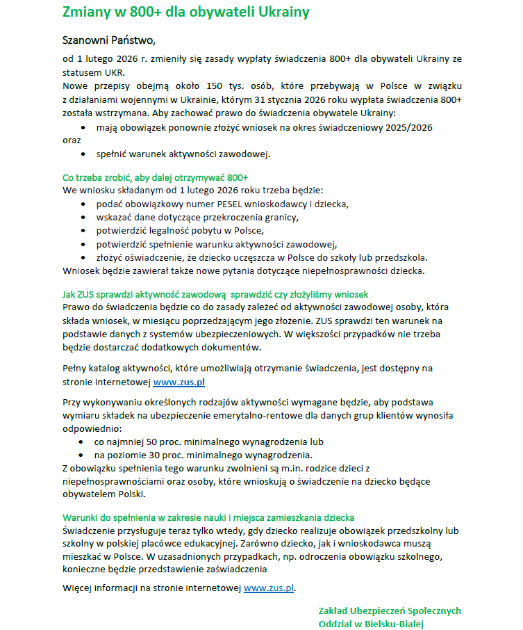 Informacja ZUS O/ Bielsko-Biała dot. zmian w 800+ dla obywateli Ukrainy.