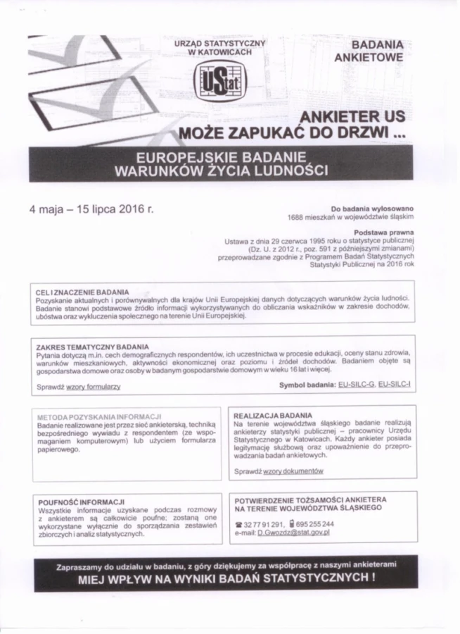Na terenie województwa śląskiego badanie realizują ankieterzy statystyki publicznej – pracownicy Urzędu Statystycznego w Katowicach. Każdy ankieter posiada legitymację służbową oraz upoważnienie do przeprowadzania badań ankietowych.