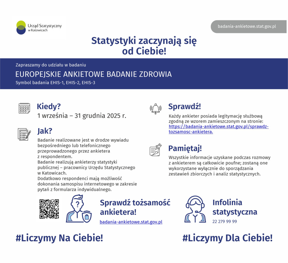 1 września 2025 r. Główny Urząd Statystyczny rozpoczął Europejskie Ankietowe Badanie Zdrowia (EHIS). Jest ono prowadzone, co 6 lat we wszystkich krajach UE, po to, aby można było porównywać wyniki o stanie zdrowia mieszkańców poszczególnych państw.