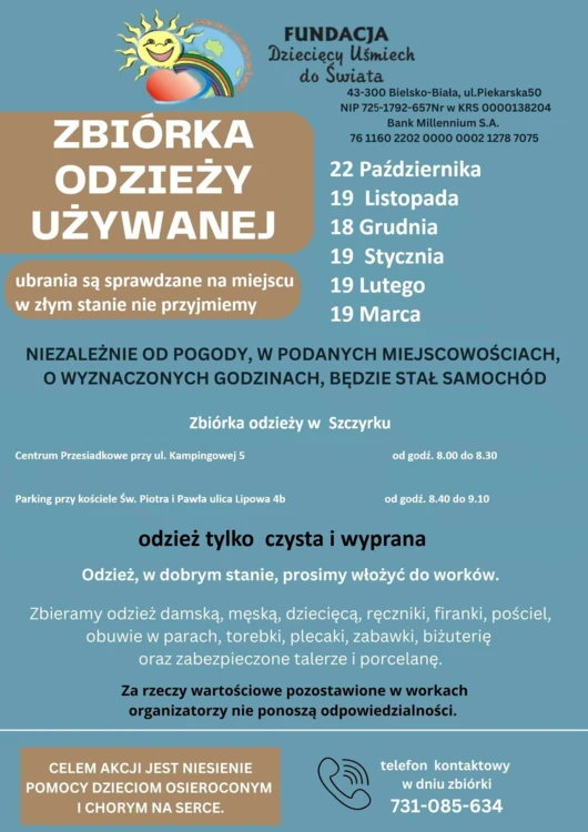 Urząd Miejski w Szczyrku zachęca do wzięcia udziału w zbiórkach odzieży używanej organizowanych przez Fundację "Dziecięcy Uśmiech do Świata", których celem jest niesienie pomocy dzieciom osieroconym i chorym na serce.