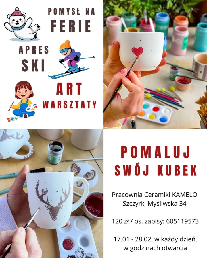 Przez cały okres ferii, od 17.01 do 28.02, codziennie w pracowni Kamelo w godzinach otwarcia (wtorek-sobota w godz. 12:00-17:00 i niedziela w godz. 10:00-13:00) malujemy kubki.