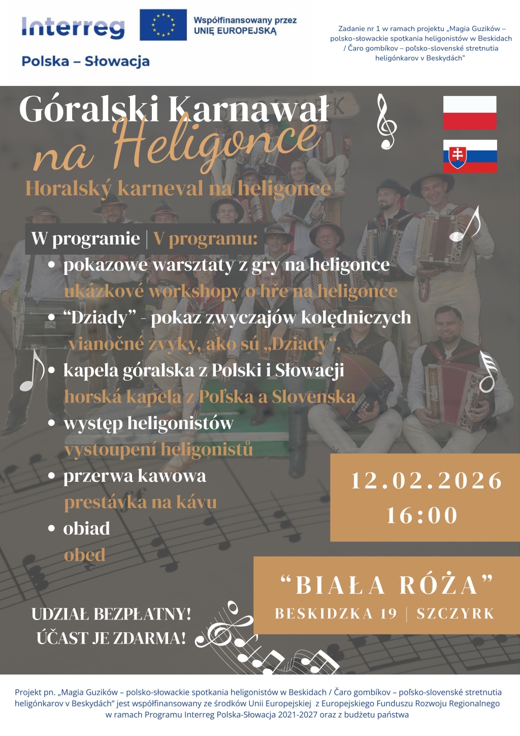 Projekt pn. „Magia Guzików – polsko-słowackie spotkania heligonistów w Beskidach / Čaro gombíkov – poľsko-slovenské stretnutia heligónkarov v Beskydách” jest współfinansowany ze środków Unii Europejskiej z Europejskiego Funduszu Rozwoju Regionalnego w ramach Programu Interreg Polska-Słowacja 2021-2027 oraz z budżetu państwa.