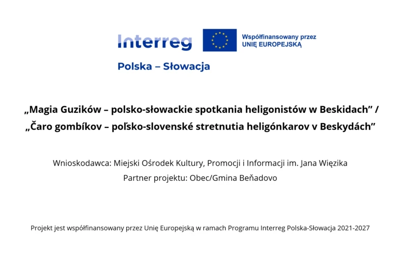 Projekt pn. „Magia Guzików – polsko-słowackie spotkania heligonistów w Beskidach / Čaro gombíkov – poľsko-slovenské stretnutia heligónkarov v Beskydách” jest współfinansowany ze środków Unii Europejskiej z Europejskiego Funduszu Rozwoju Regionalnego w ramach Programu Interreg Polska-Słowacja 2021-2027 oraz z budżetu państwa.
