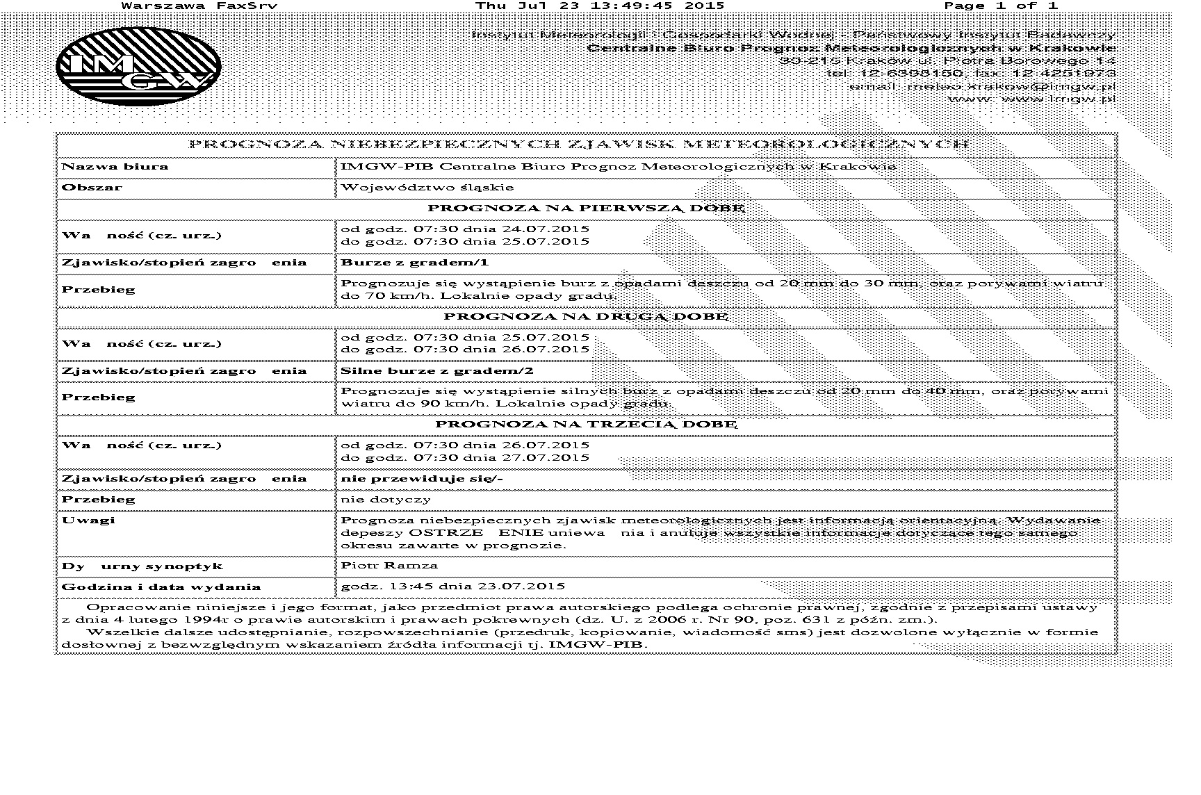 23.07.2015 - PROGNOZA NIEBEZPIECZNYCH ZJAWISK METEOROLOGICZNYCH