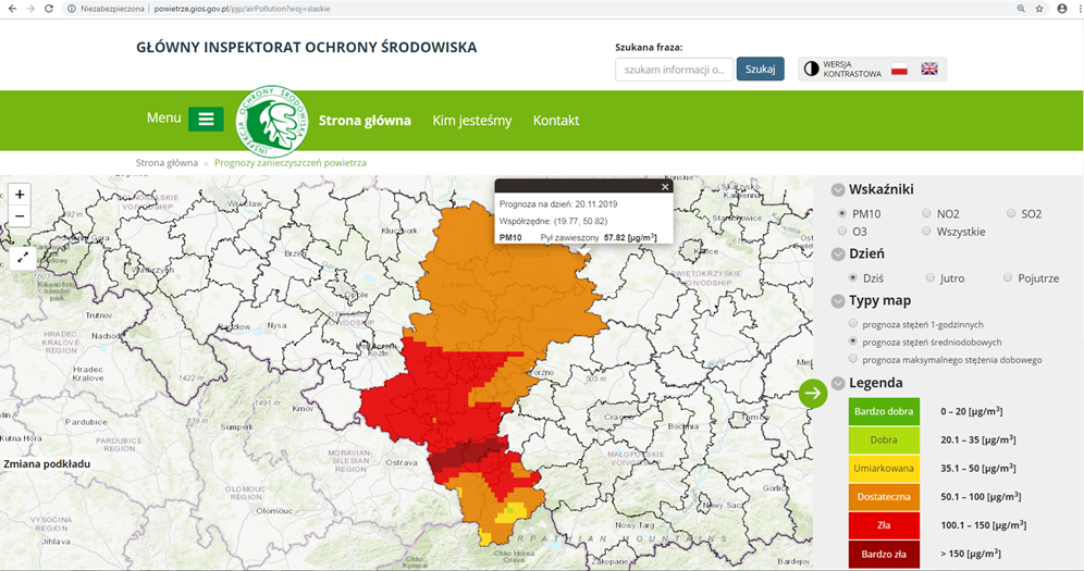 Powiadomienie -aktualizacja powiadomienia z dnia 19.11.2019 r. o ryzyku wystąpienia przekroczenia poziomu informowania dla pyłu zawieszonego PM10 w powietrzu - POZIOM II -data wystapienia 20.11.2019 r.
